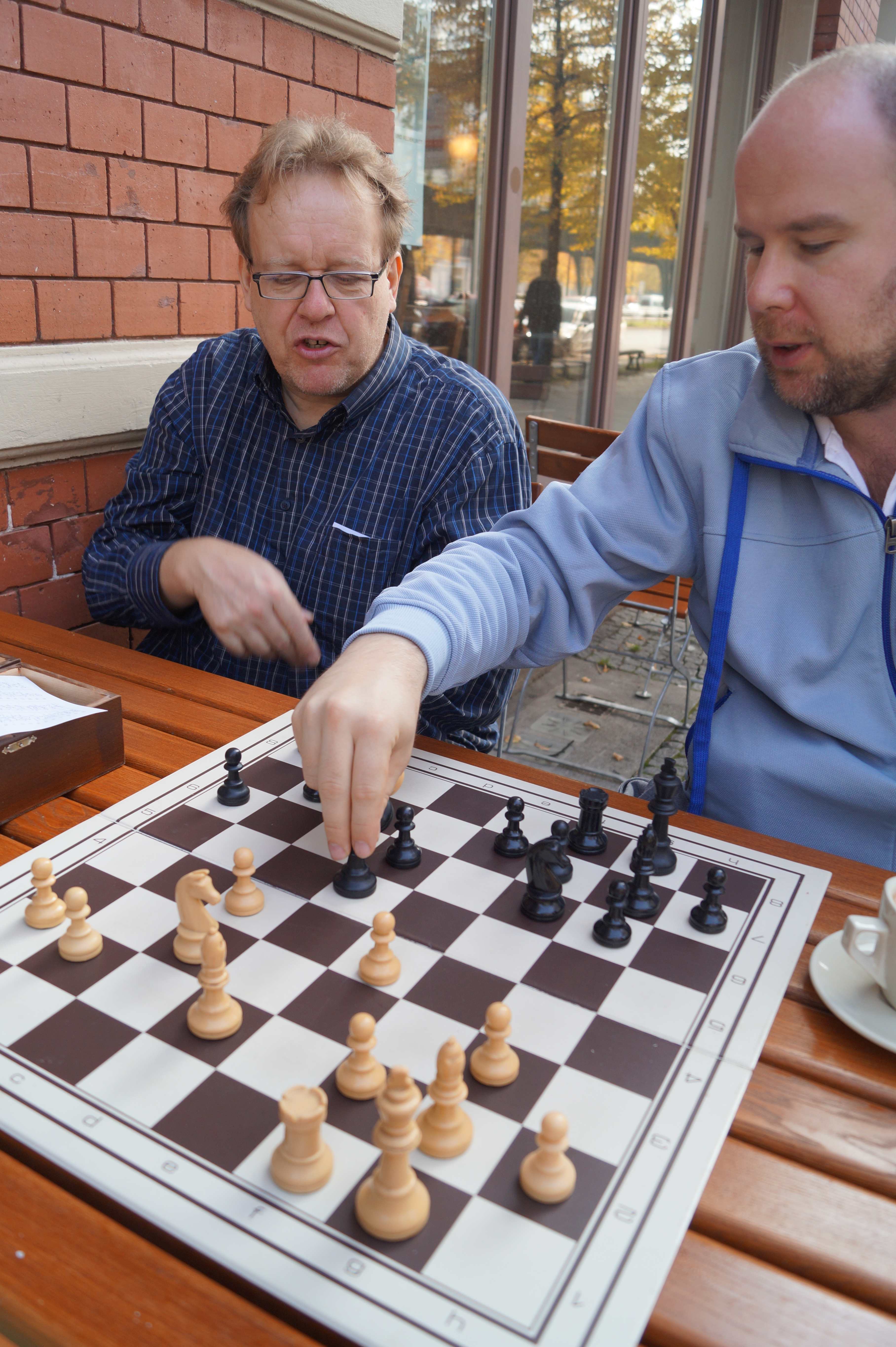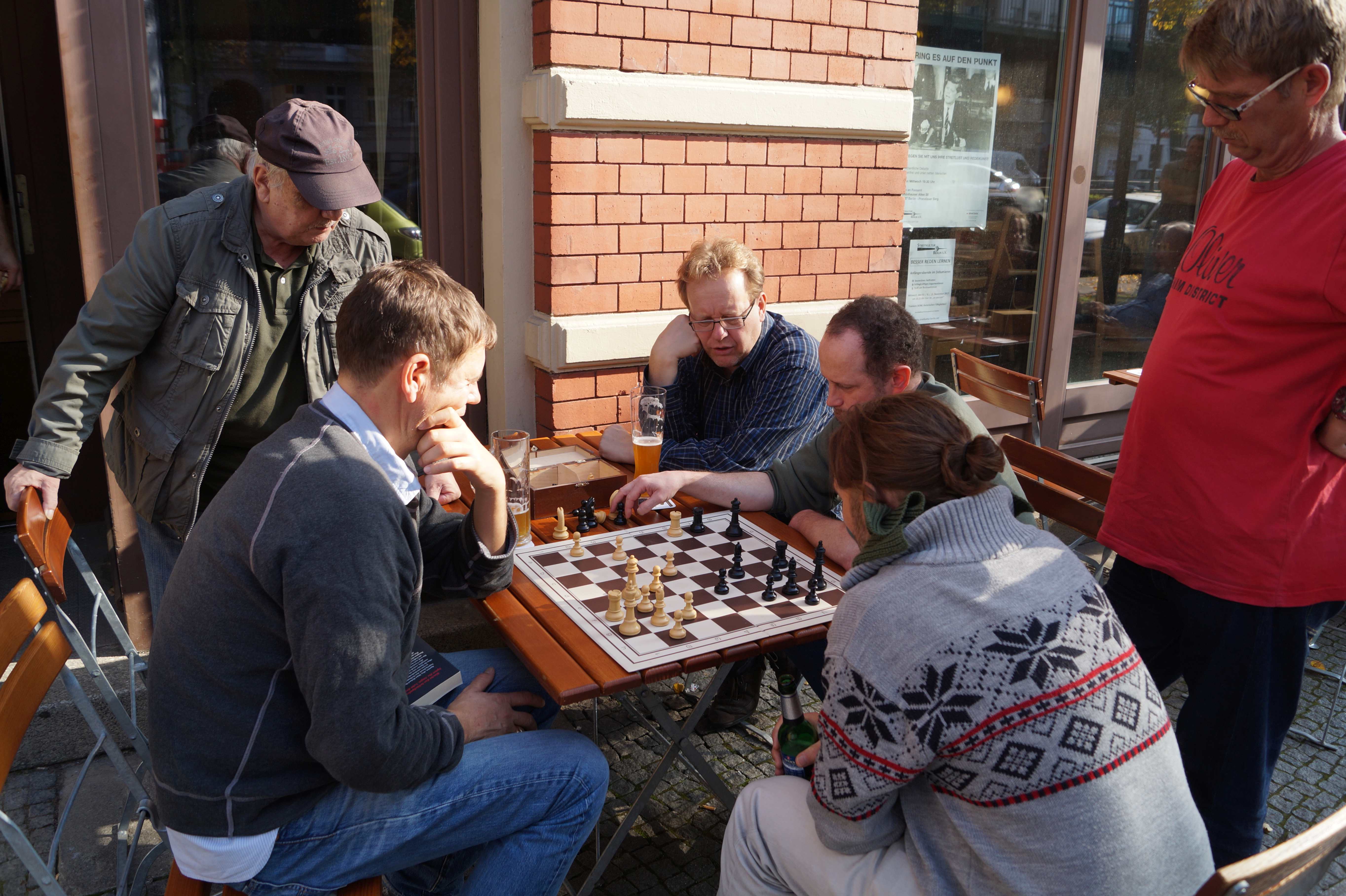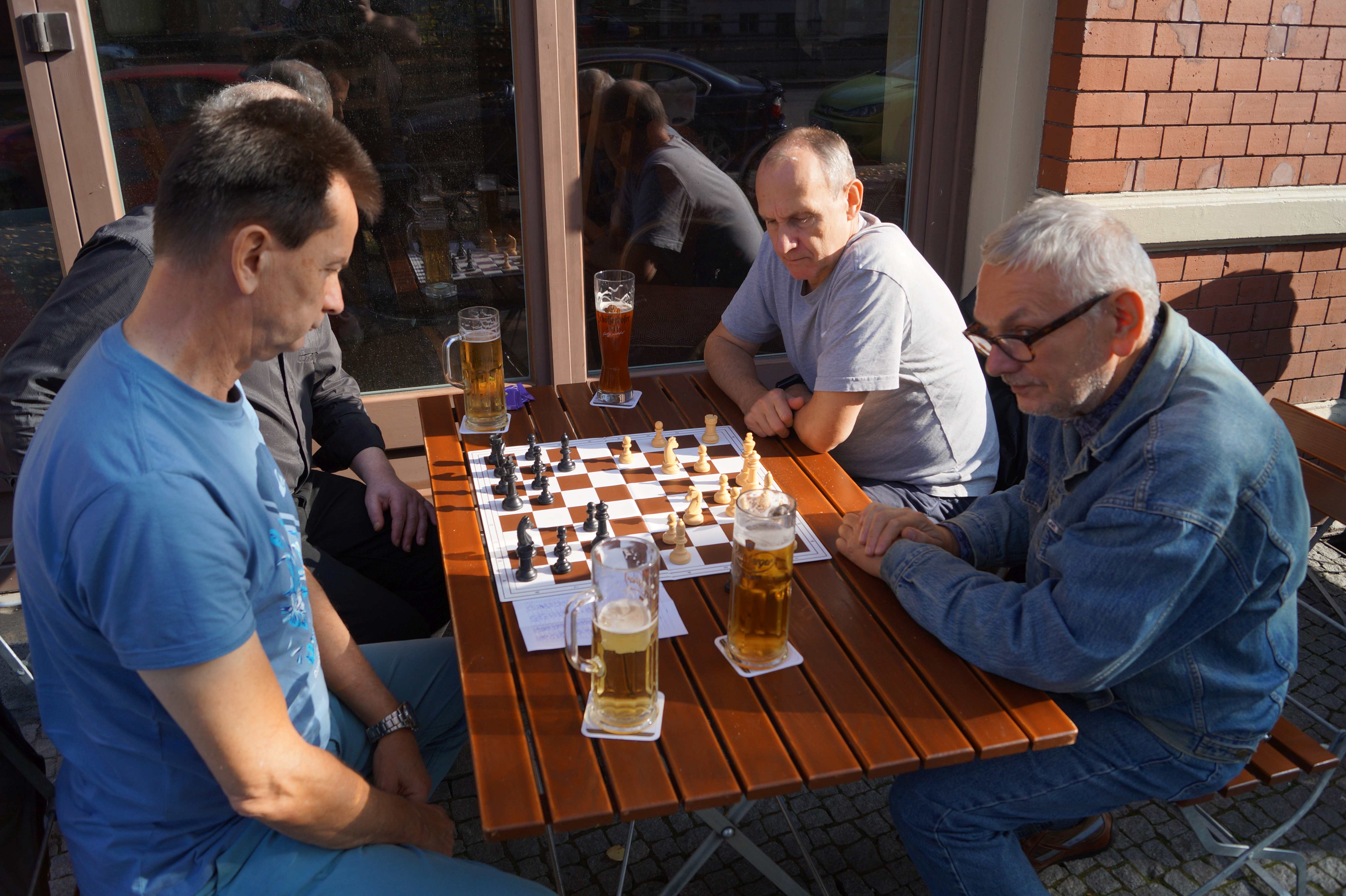23 Tage nach dem kalendarischen Herbstanfang wird Berlin mitten im Oktober von einer Wärmeperiode heimgesucht. Bei 21-22 Grad stellte der Wirt die Stühle und Tische vor sein Café und wir konnten draußen unsere Partien analysieren und dabei dem Geratter der auf dem Hochbahnviadukt vorbeifahrenden U-Bahnen "lauschen". Heute soll es mit 23 Grad sogar noch ein bißchen wärmer werden.