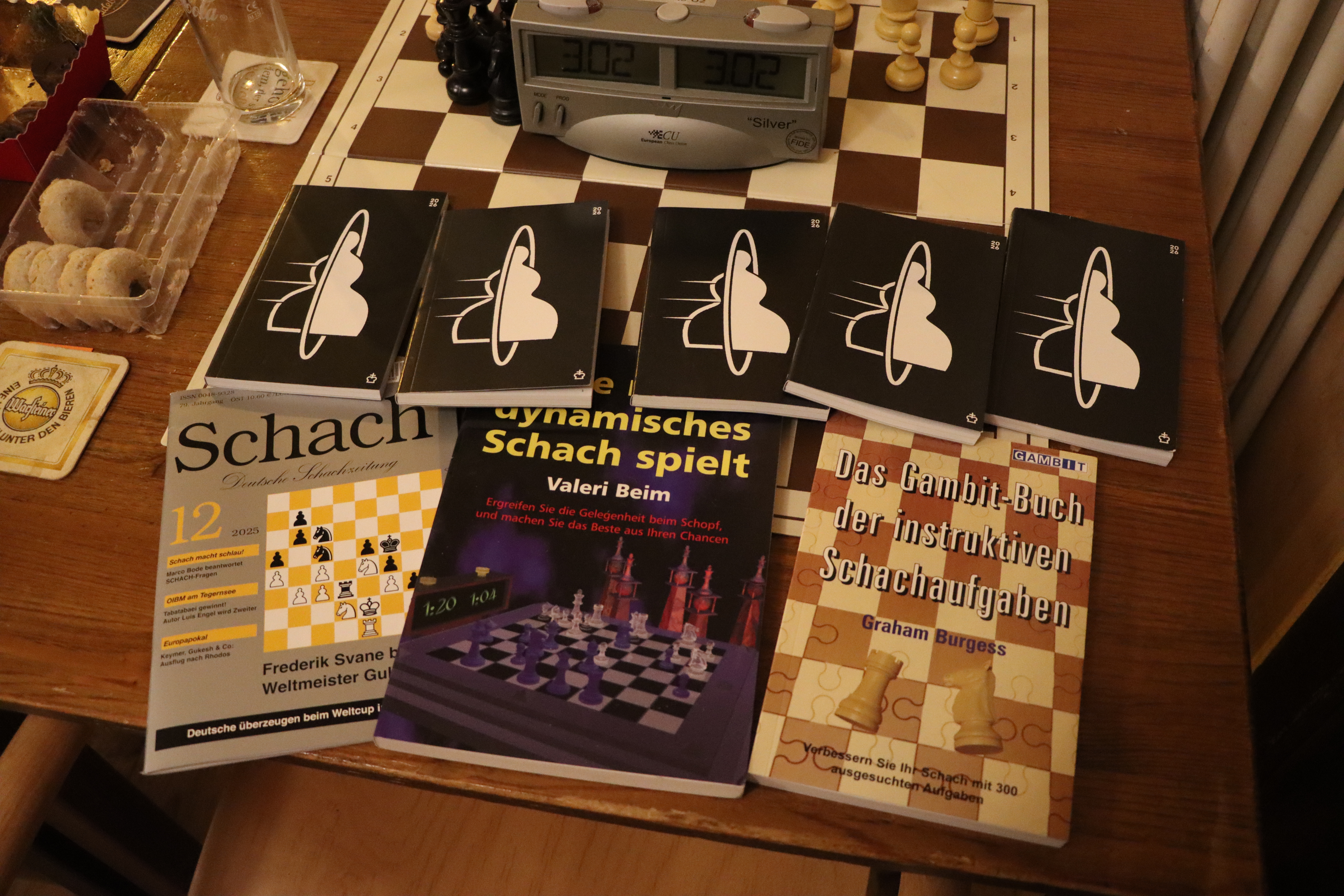 Für das Turnier hatte Binding ein wenig Schachliteratur aus der Vereinskasse spendiert, darunter fünf Schachkalender. Da zwei Spieler bereits vor der Siegerehrung gegangen waren und einer verzichtete, kamen alle anderen Teilnehmer in den Genuß eines Preises. Darunter auch Mario Tops, der nach eigener Aussage das erste Blitzturnier seit mindestens 30 Jahren mitspielte. Die schnelle Bedenkzeit (3+2, früher 5+0) ist halt nicht sein Steckenpferd.