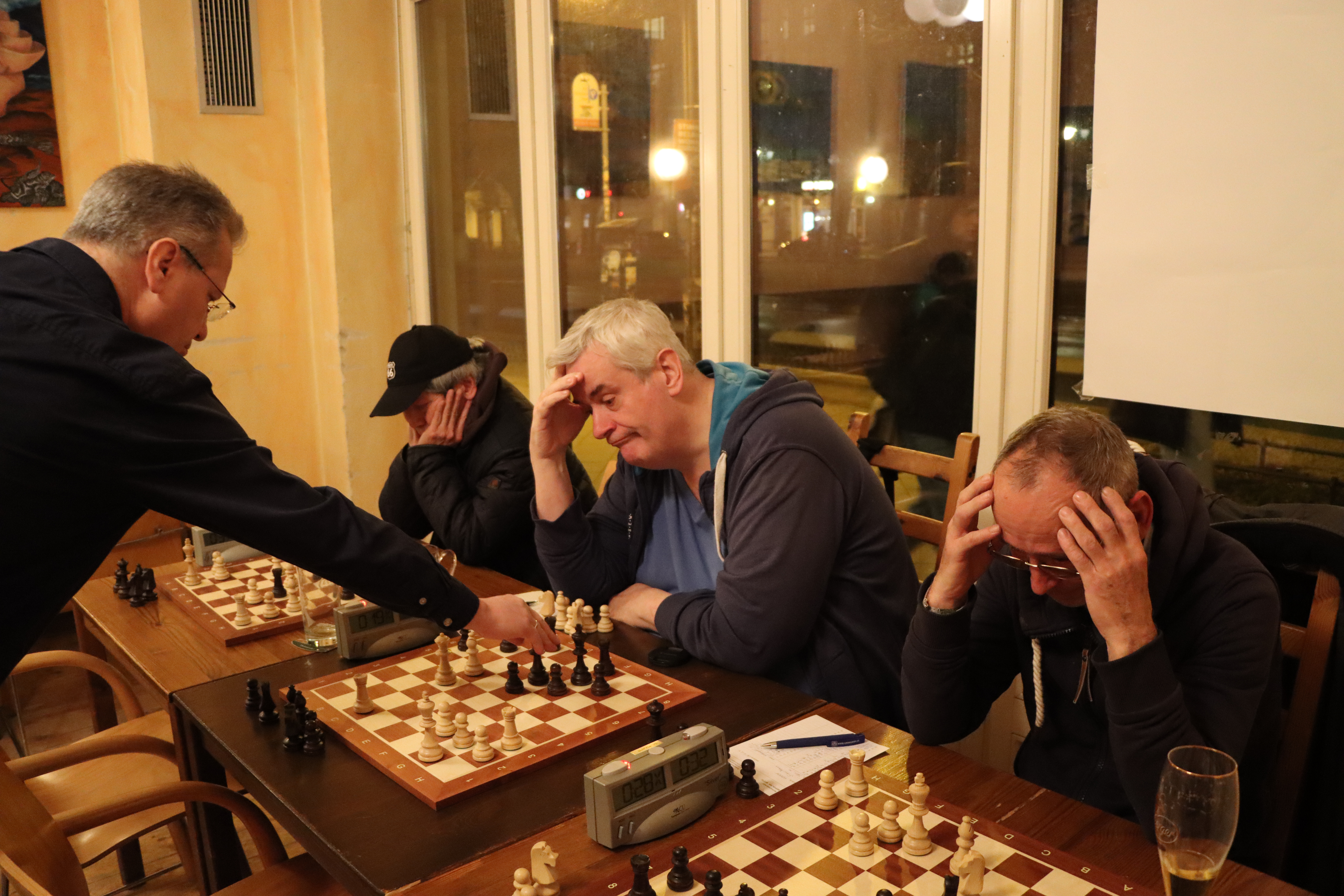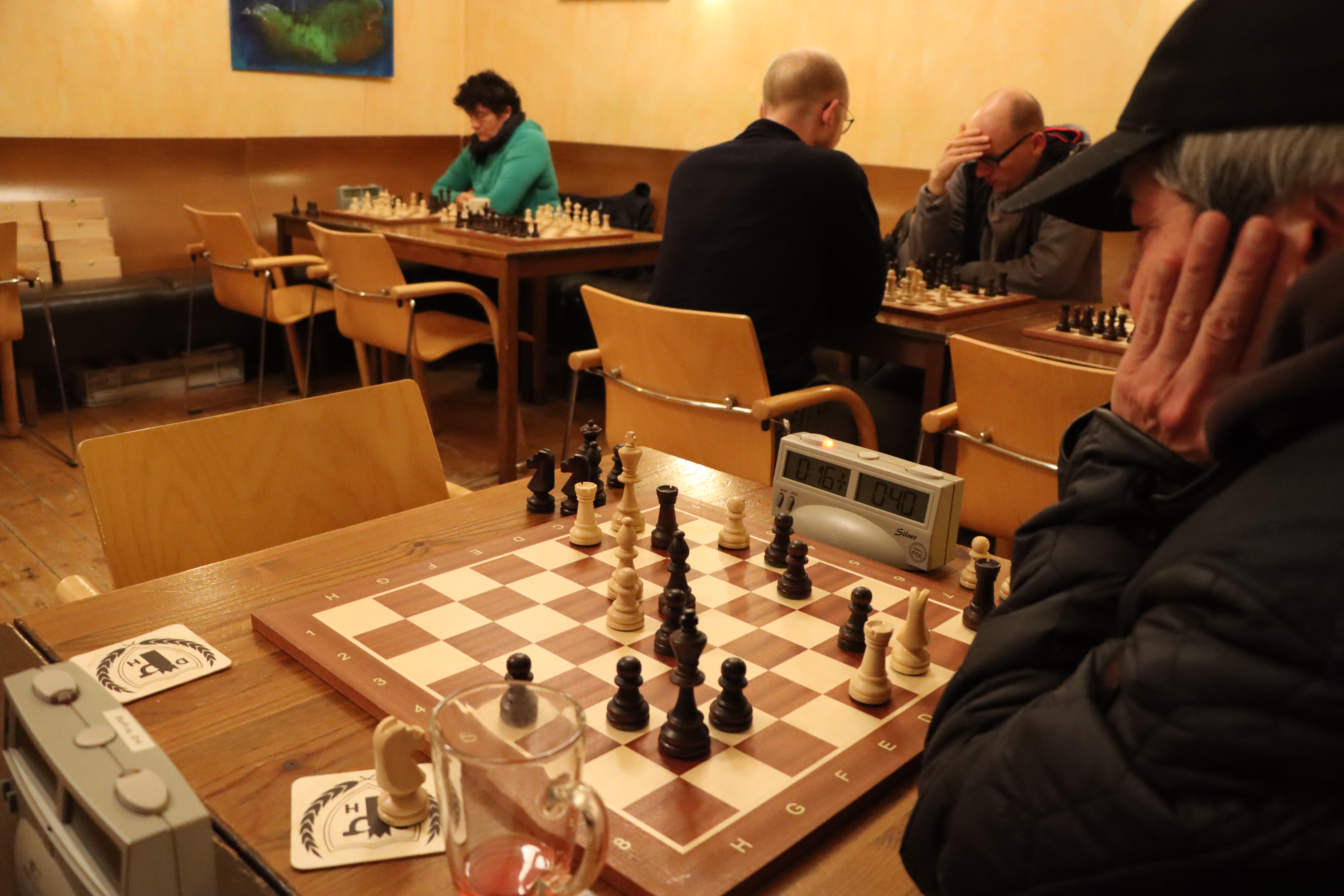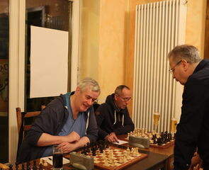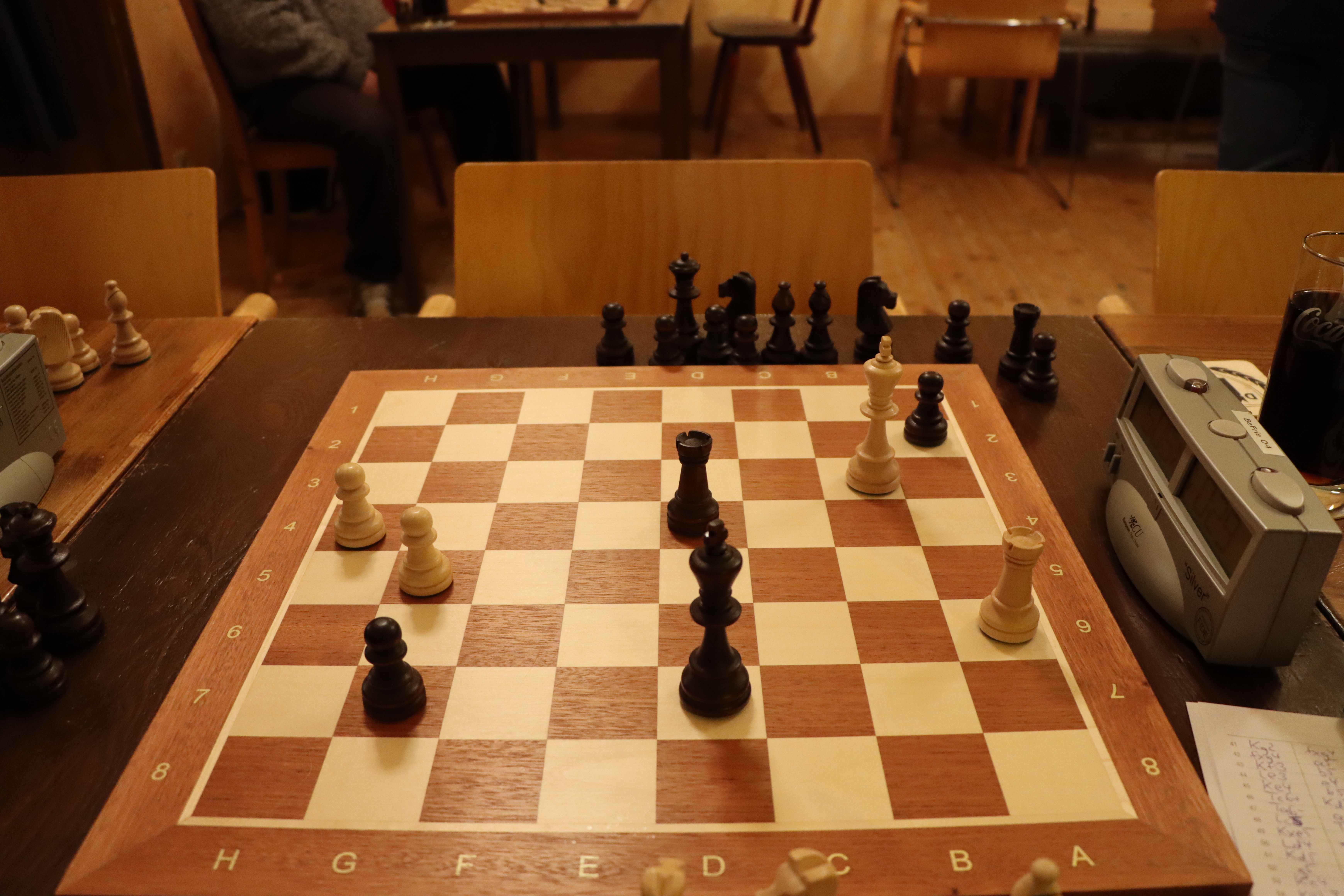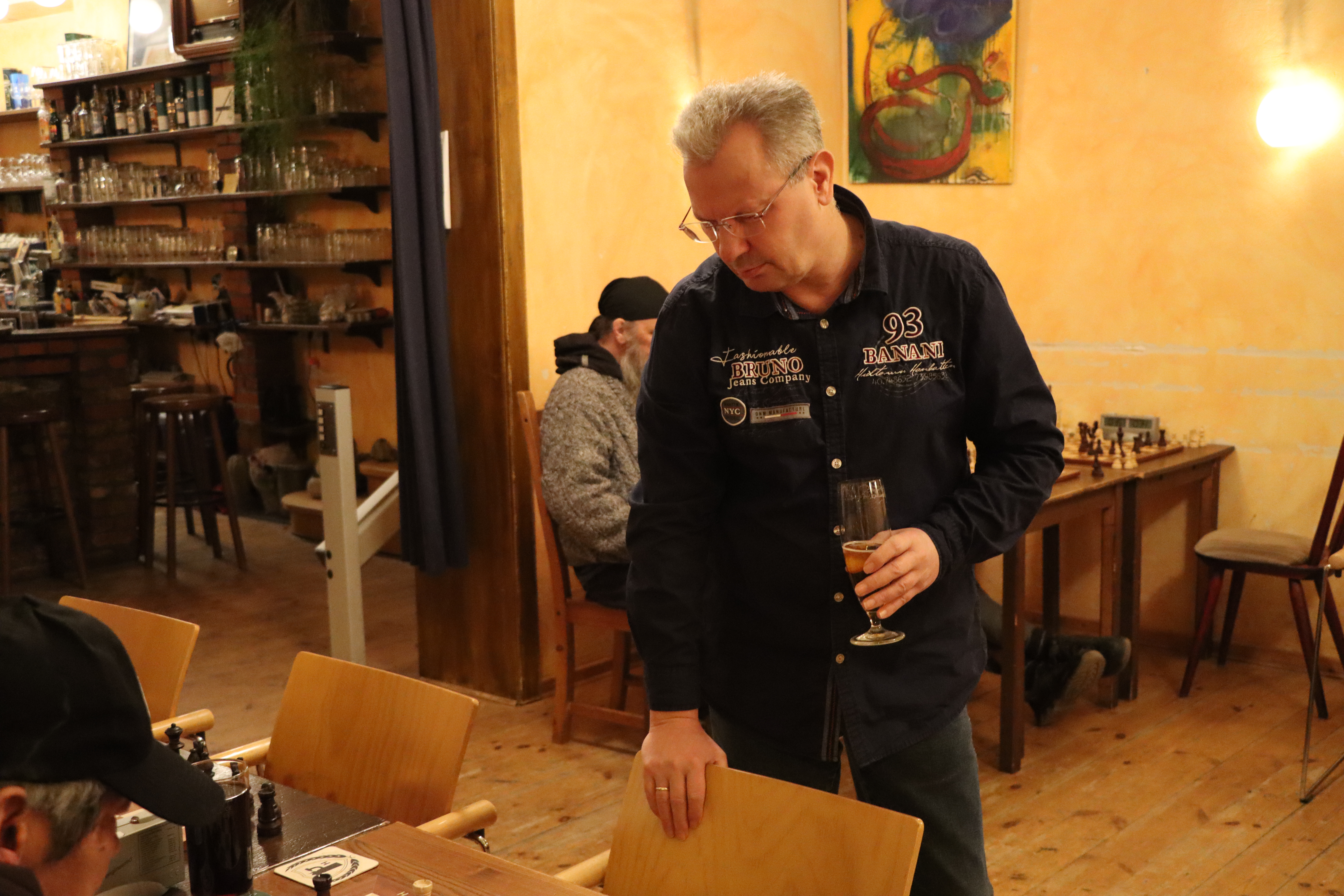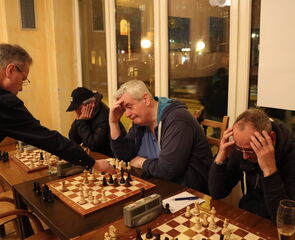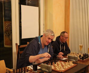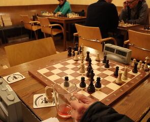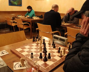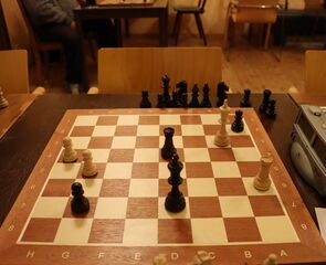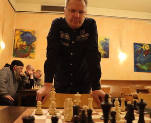 Am heutigen Freitag stellte sich Uwe Sabrowski (DWZ 1915) anfänglich fünf Gegnern, später sieben, im 60-Minuten-Uhrensimultan. Nur einer vermochte ihn zu überwinden: unser mongolischer(?) Gast aus Lichtenberg, der öfter im "En Passant" vorbeischaut. Auch dem Berichterstatter gelang ein kleiner Erfolg, obwohl ich mit DWZ 1963 eigentlich 64 Punkte zuviel hatte. Aber Uwe ließ mich mitspielen und zerstörte mich mit seinem Morra-Gambit. Mit viel Glück rettete ich mich in ein Unentschieden. Eine Punkteteilung wäre auch beinahe Mario Tops gelungen. Am Ende war dies aber einer von sechs Siegen Uwes.