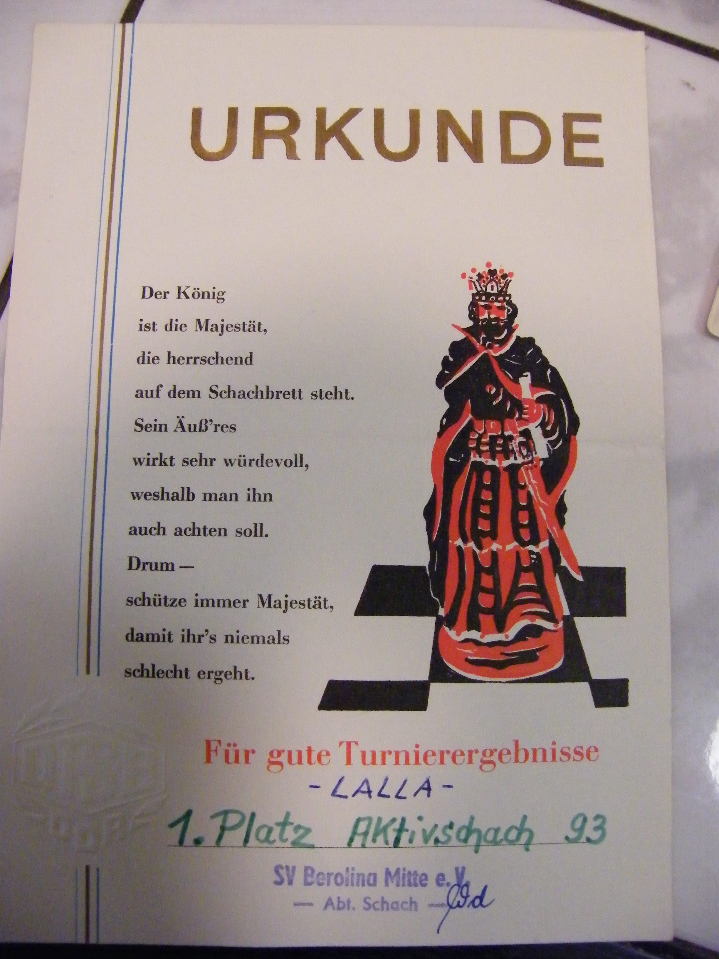Siegerurkunde Mario Janik Aktivschachmeisterschaft 1993, signiert von Werner WindmüllerUrsprünglich proklamierte Andreas Reiche einen wahrscheinlichen 1. Platz in der Aktivschachmeisterschaft 1993. Doch Mario Janik hat eine Urkunde für seinen 1. Platz.